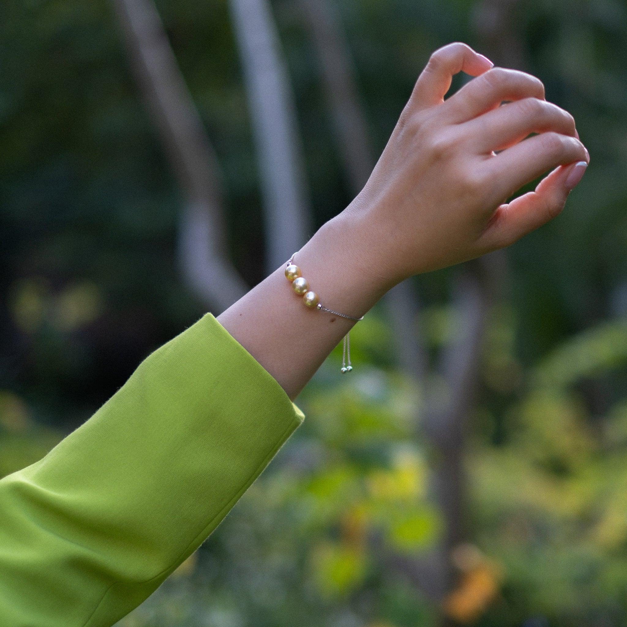 Elevate your look with this luxurious 14K white gold Golden South Sea Pearl Trio Bracelet. Featuring three delicate South Sea Pearls delicately hung from a delicate golden bolo chain, this piece of jewelry is perfect for adding a touch of elegance to any wardrobe.