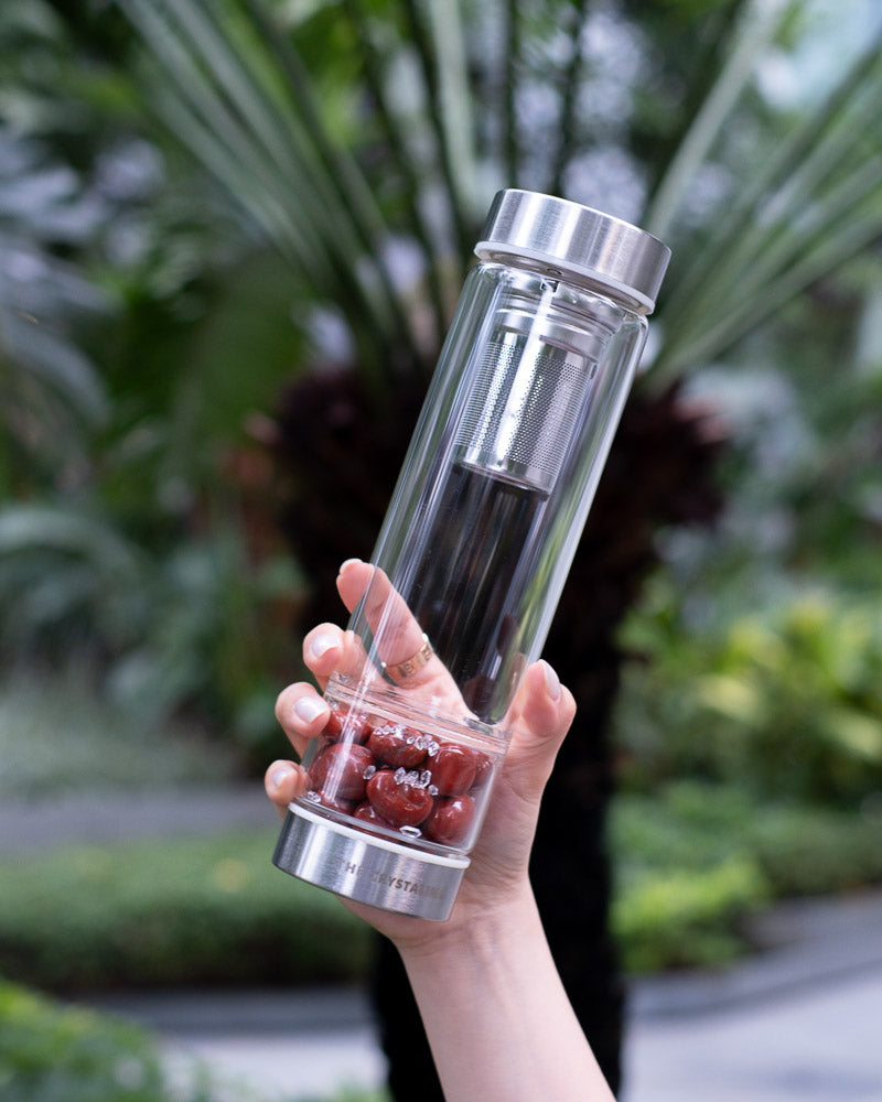 Our patented tea bottle is infused with Herkimer Diamond and Red Jasper, making it the perfect addition to your daily routine.