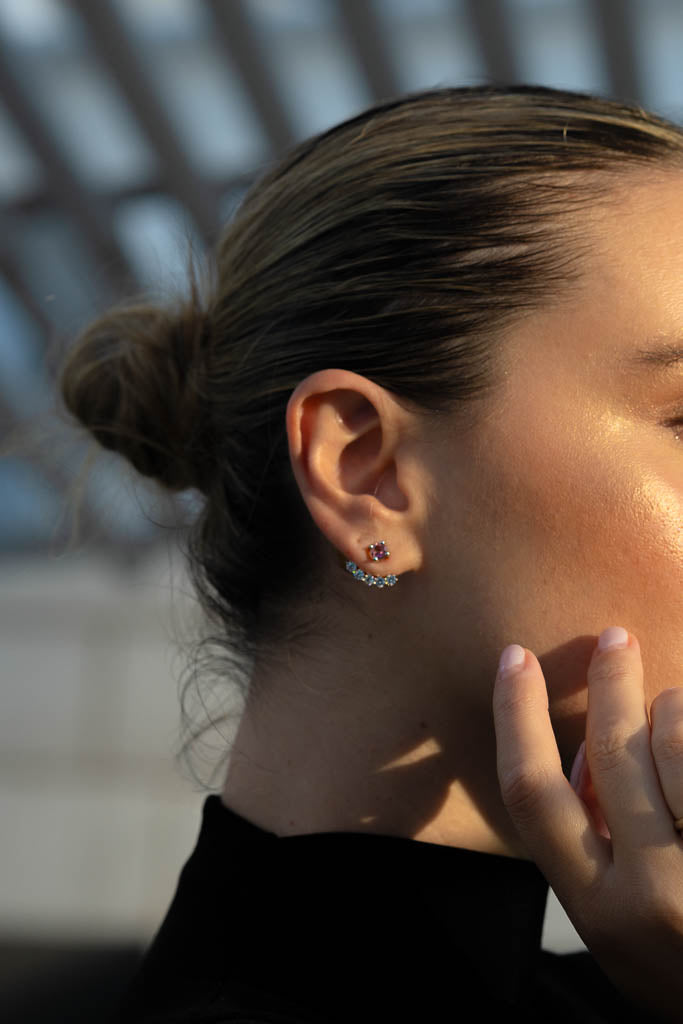 Featuring a 4.5mm pink tourmaline with a detachable rainbow zirconia accent, these earrings offer flexible styling options. The pink tourmaline delivers subtle elegance and durability, while the removable zirconia component allows you to transition from a vibrant two-tone look to understated sophistication.