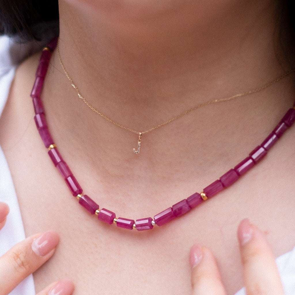 This exquisite handmade Ruby Bamboo Necklace is crafted from precious ruby and rhodochrosite gemstones. The cutting of the stones is expertly done to bring out the beautiful colors and create an eye-catching piece of jewelry. The gold components completes this luxurious necklace.