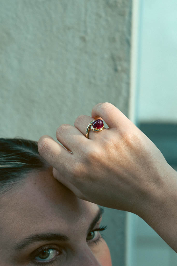 This Ruby Oval Statement Ring features a striking 7.19-carat cabochon ruby measuring 11.4 x 9.76 x 6.62 mm.
